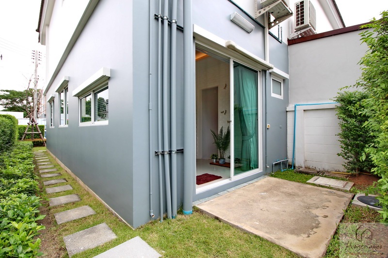 บ้านหลังนี้มีขนาดหน้ากว้าง 4 เมตร สามารถจอดรถได้ 1 คัน พื้นเฉลียงทรายล้างปูด้วยกระเบื้องเซรามิค 30 x 30 ซม. ประตูหน้าบ้านอลูมิเนียมสีขาว กระจกเขียวตัดแสง