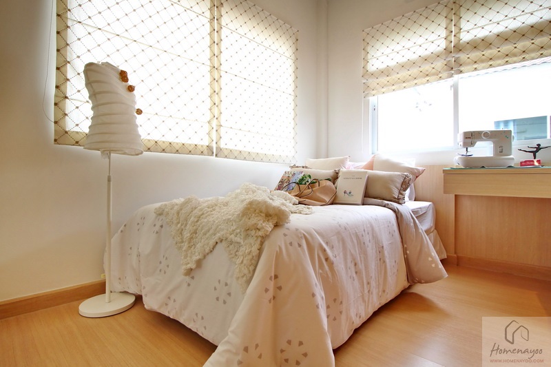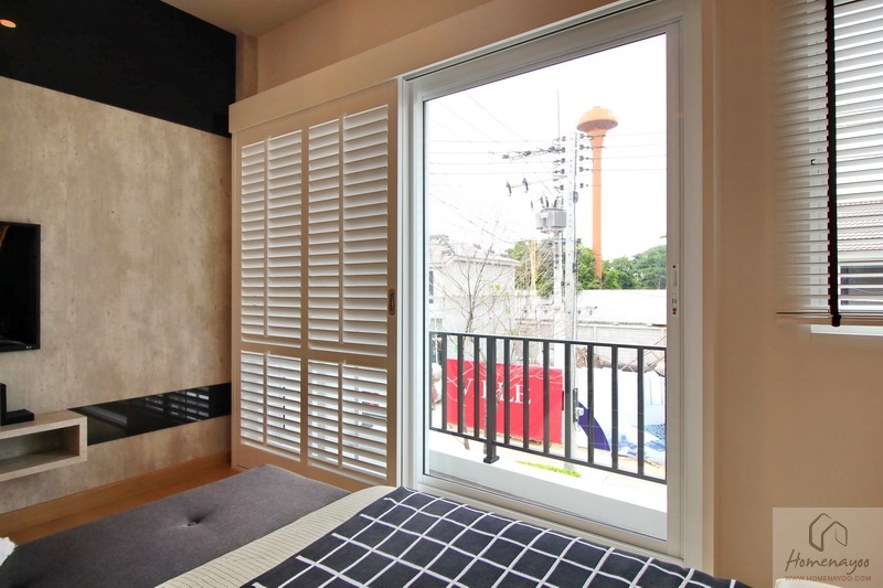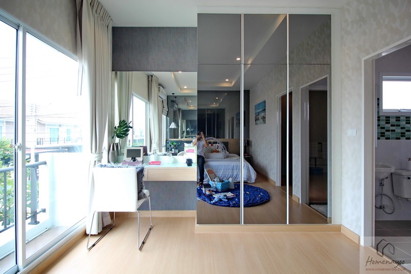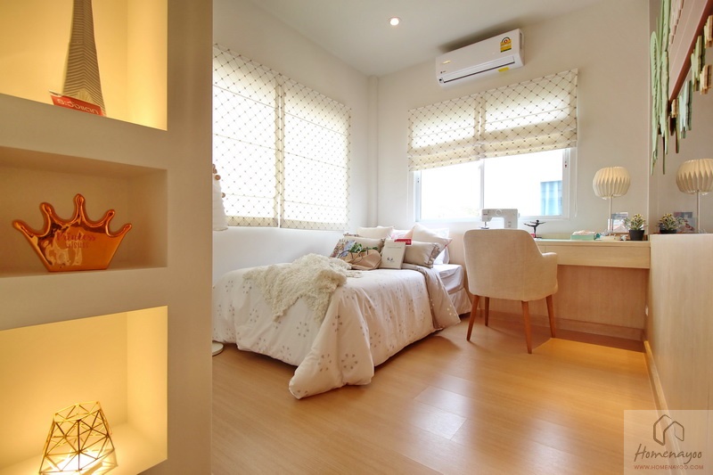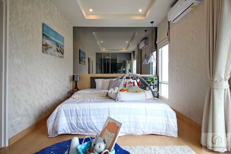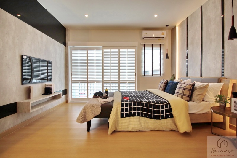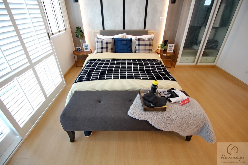 เตียงนอนเลือกวางขนาด 5 ฟุตให้ดูเป็นตัวอย่าง แต่ด้วยขนาดห้องสามารถอัพเป็นเตียงคิงไซส์ 6 ฟุตได้สบายๆ