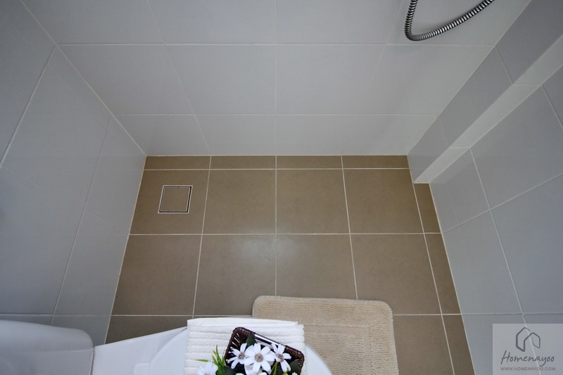 พื้นที่อาบน้ำด้านในลดระดับพื้นลงเล็กน้อยกันน้ำไหล ให้ฝักบัวสายอ่อนพร้อมวางระบบสำหรับเครื่องทำน้ำอุ่นให้เรียบร้อย
