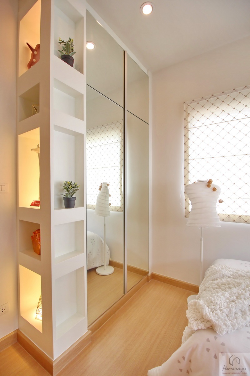 ด้านข้างเตียงฝั่งขวาบิวท์อินตู้เสื้อผ้าทรงสูงติดเพดาน เหลือสเปซใช้งานหน้าตู้ให้สามารถแต่งตัวได้อย่างสะดวก ยืดแขนยืดขาเปลี่ยนเสื้อผ้าได้เต็มที่
