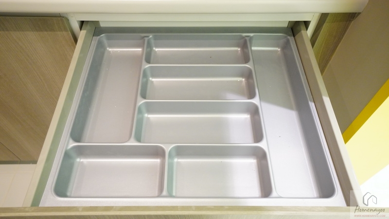 อีกฝั่งจะเป็นลิ้นชักพร้อมถาดจัดระเบียบช้อน-ส้อม ตรงกลางเป็นช่องวางไมโครเวฟขนาดมาตรฐาน ผนังด้านหลังติดเต้าเสียบปลั๊กไฟมาให้ 1 จุด ส่วนด้านล่างจะได้ลิ้นชักรางเลื่อนมาอีก 1 ช่อง เลือกเก็บของได้ตามความต้องการ