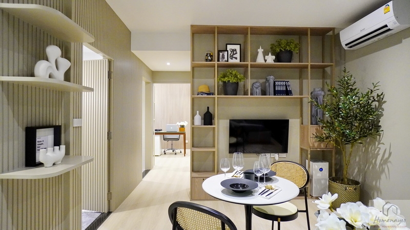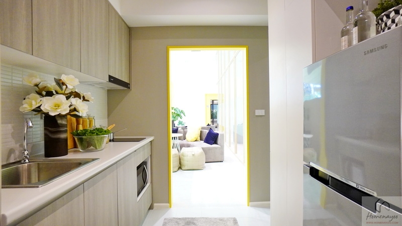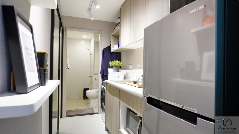 เปิดประตูเข้ามาภายในห้องพัก เราจะเจอกับห้องครัวเปิด และ Laundry Area โดยตู้เก็บของทางฝั่งซ้ายมือจะเป็นเพียงการตกแต่งขึ้นมาให้ดูเป็นไอเดีย ของจริงจะเป็นพื้นที่หน้ากว้างโล่ง ๆ ให้เราเลือกวางเฟอร์นิเจอร์อื่น ๆ เองได้ตามชอบ