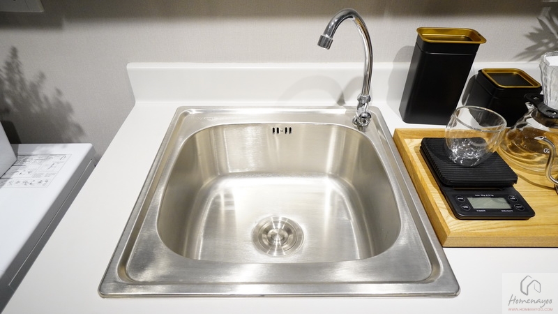 ถัดมาจะเป็นชุดครัวที่ได้มากับตัวห้อง เป็นเคาน์เตอร์ครัวขนาด 1.5 x 0.60 เมตร หน้าท็อปเป็นเมลามีนสีขาว ที่ทนความร้อน ความชื้นได้ค่อนข้างดี ติดตั้ง Sink มาให้ พื้นที่ส่วนที่เหลือ สามารถใช้เป็นที่เตรียมอาหาร, ทำขนม, ชงชา-กาแฟ หรือจะซื้อเตาแม่เหล็กไฟฟ้าแบบเสียบปลั๊กมาทำอาหารง่าย ๆ ทานที่ห้องก็ได้