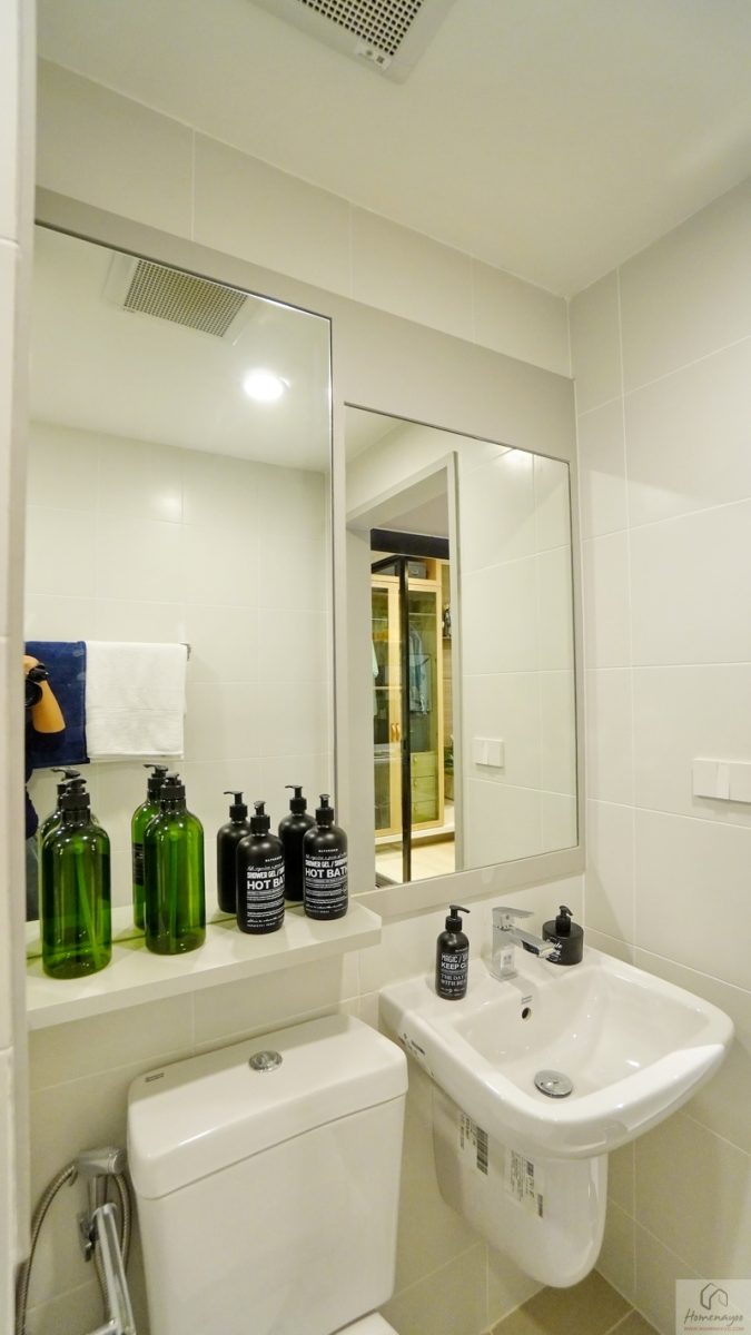ห้องนี้จะเป็นห้องหน้ากว้าง ตกแต่งพื้นและผนังคุมโทนสีสว่างเช่นเดียวกัน ภายในห้องจะได้อ่างล้างหน้า + กระจกเงา พร้อมโถสุขภัณฑ์ 2 Piece ระบบ Dual Flush พร้อมอุปกรณ์ประกอบครบเซ็ต และมีตัวช่วยในการระบายอากาศเป็นพัดลมฝังฝ้า 1 เครื่อง