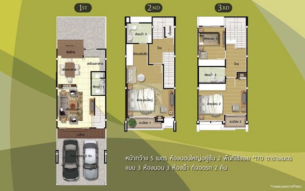 หน้ากว้าง 5 เมตร ห้องนอนใหญ่อยู่ชั้น 2 พื้นที่ใช้สอย 170-174 ตารางเมตร* แบบ 3 ห้องนอน 3 ห้องน้ำ ที่จอดรถ 2 คัน