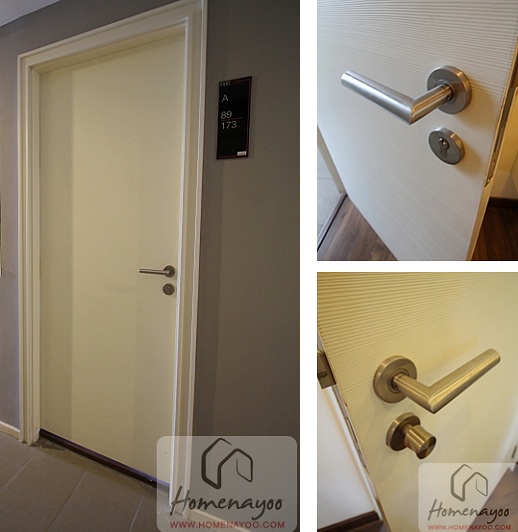 ประตูทางเข้าห้องจะเป็นประตูบานสำเร็จรูปทาสีขาว ผนังข้างประตูติดแผ่นป้ายเลขที่ห้องเป็นป้ายอคริลิค ส่วนมือจับที่ประตูทางเข้าห้องเป็นแบบก้านโยกสแตนเลส ด้านนอกมีที่เสียบรูกุญแจ ด้านในมีตัวบิดล็อก
