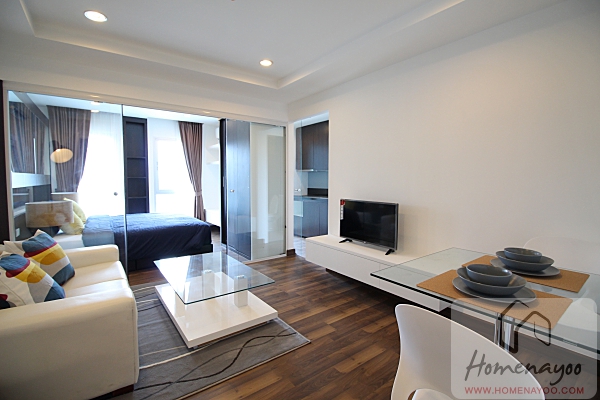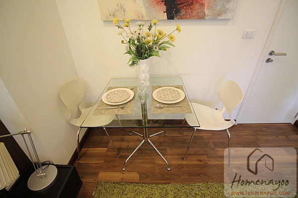 ห้องตัวอย่างที่เราไปสำรวจกันเป็นห้องแบบ 1 ห้องนอน 33.5 ตารางเมตรค่ะ เข้ามาจะเป็นส่วนห้องนั่งเล่น ถัดเข้าไปเป็นส่วนห้องนอน โดยจะมีฉากกั้นห้องกระจกมาให้ระหว่างห้องนอนกับห้องนั่งเล่น ส่วนครัวกับห้องน้ำจะจัดไว้อีกฝั่งของห้อง โดยส่วนครัวจะอยู่ติดระเบียงทำให้ระบายอากาศได้ง่ายเวลาทำอาหาร ระเบียงขนาดค่อนข้างใหญ่ค่ะ ใช้วางแอร์คอมเพรสเซอร์ เครื่องซักผ้าและราวตากผ้าได้ โครงการขายแบบ Fully Furnished คือมีเฟอร์นิเจอร์และชุดครัวมาให้ ห้องตัวอย่างจะเป็นอย่างไรไปดูกันเลย