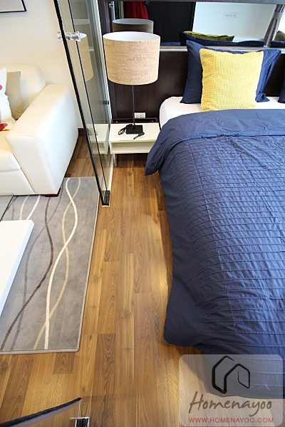 เปิดประตูเข้าไปจะเจอส่วนห้องนั่งเล่นมองต่อเนื่องไปที่ส่วนห้องนอนที่มีฉากกั้นห้องกระจกอยู่ พื้นห้องเป็นไม้ลามิเนตหนา 8 มม. ระยะดูทีวีจากโซฟาประมาณ 2.5 เมตร เหมาะจะวางทีวีขนาดประมาณ 40 – 50 นิ้วได้กำลังดี