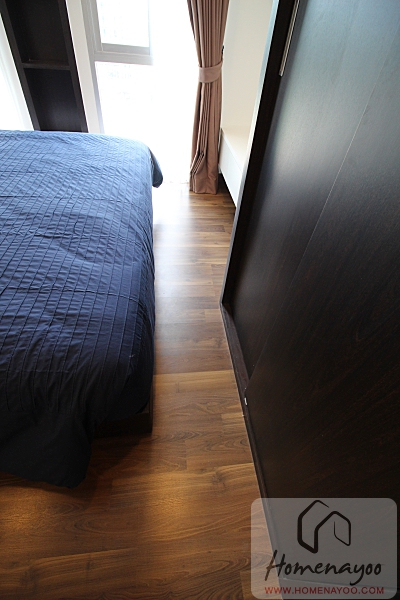 เข้าไปดูในห้องนอนกันต่อค่ะ จะมีฉากกั้นห้องนอนเป็นประตูบานเลื่อนกระจกเปลือยแบบเปิดได้ 2 บานตรงกลาง ข้างๆอีก 2 บานเป็นบานฟิกซ์ ตัวรางจะแขวนอยู่ด้านบนติดกับฝ้าเพดาน