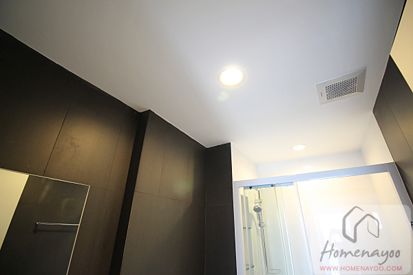 ผนังปูกระเบื้องจรดเพดาน เพดานห้องน้ำติดไฟดาวน์ไลท์ เพดานเหนือโถสุขภัณฑ์มีพัดลมดูดอากาศมาให้