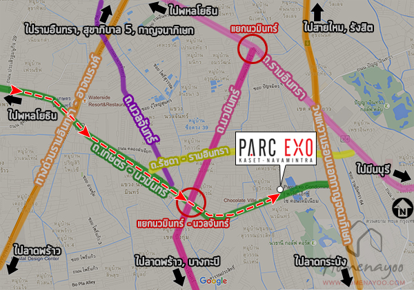 เรามีภาพการเดินทางโดยรถมาให้ชมกัน เส้นทางการเดินทางตามลูกศรแดง โดยเริ่มเดินทางบน ถนนเกษตร – นวมินทร์ → ตรงผ่านใต้ทางด่วนรามอินทรา – อาจณรงค์ → ตรงผ่านแยกนวมินทร์ – นวลจันทร์ไปประมาณ 2 กิโลเมตรก็จะเจอโครงการ PARC EXO เกษตร – นวมินทร์ ทางฝั่งซ้ายมือแล้วค่ะ ไปดูภาพการเดินทางกันต่อเลยค่า