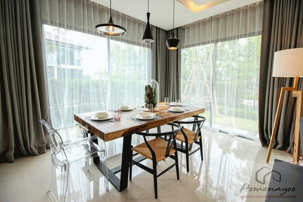 • การออกแบบโครงการและวัสดุ แบบบ้านของโครงการมีทั้งหมด 3 แบบ เป็นบ้านเดี่ยวสองชั้น โดยจะเป็นบ้านขนาดกลางถึงใหญ่ทั้งหมดค่ะ คือบ้าน Petunia, Primrose และ Pine โดยบ้าน Pine จะวางผังตามแนวติดถนนโครงการทั้งหมด และมีประตูทางเดินคนเข้า-ออกจากหลังบ้าน ตัวบ้านโดดเด่นในเรื่องของการจัดผังที่แบ่งแยกโซนพักผ่อนและโซน Service ชัดเจนค่ะ เฉลียงทางเข้าทั้งหน้าบ้านและลานซักล้างกว้างขวาง ประตูหน้าต่างมีช่องแสงธรรมชาติขนาดใหญ่ มุมอับแสงของบ้านมีเพียงบางจุดเท่านั้นค่ะ โดยชั้นล่างช่องแสงจะเป็นประตูบานเลื่อนทั้งหมดทำให้เห็นวิวสวนแบบเปิดโล่งกันเต็มๆ ส่วนหน้าต่างห้องนอนชั้น 2 จากหน้าบ้านก็จะมีฟินระแนงกันแดด แบบเปิด-ปิดได้ เพื่อเพิ่มความเป็นส่วนตัวและความสวยงามของหน้าตาบ้าน ห้องนอนทุกห้องเหลือพื้นที่ข้างเตียงกว้างขวางค่ะ ห้องน้ำทุกห้องมีโซน Shower แยกส่วนเปียกส่วนแห้ง สุขภัณฑ์ American Standard ทั้งหมด ส่วนห้องครัวก็จะได้เป็นครัวไทยขนาดใหญ่มีเคาน์เตอร์ปูนและอ่างล้างจานสแตนเลส Build ให้เสร็จ แต่ต้องต่อเติมบานตู้เองนะคะ หลังคาบ้านเป็นทรงปั้นหยามีฝ้าชายคาระบายอากาศและเดินท่อรางน้ำฝนให้เรียบร้อย มีสัญญาณกันขโมยระบบ Motion Sensor ติดให้ค่ะ