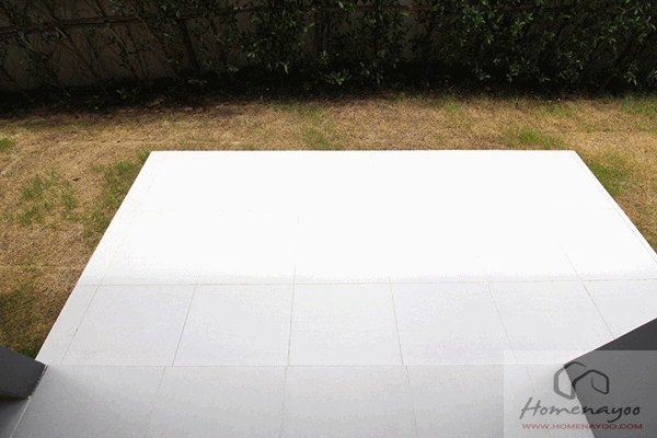 ระเบียงปูกระเบื้องเซรามิกขนาด 40×40 ซม. ขอบทรายล้าง ราวกันตกเป็นกระจก