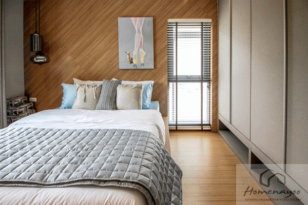 พื้นที่ข้างเตียงฝั่งซ้ายมือเหลือ 50 ซม. ส่วนขวามือเหลือ 40 ซม. แนะนำให้วางตู้เสื้อผ้าเป็นแบบบานเลื่อน