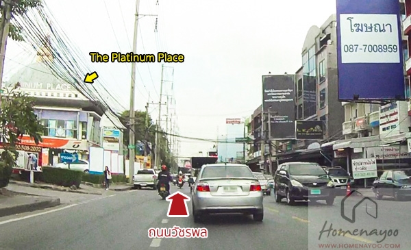 เมื่อเข้าสู่ทางตรงของถนนวัชรพล ทางซ้ายมือจะมีจุดสังเกตเป็น The Platinum Place ทางขวามือจะเป็นอาคารพาณิชย์และตึกแถวสูง 4 ชั้นครึ่ง