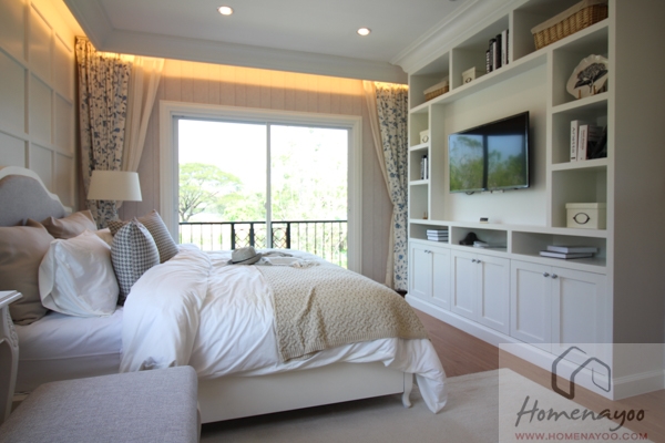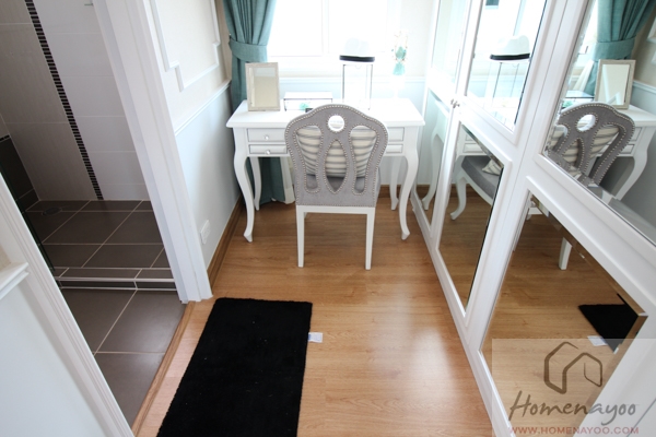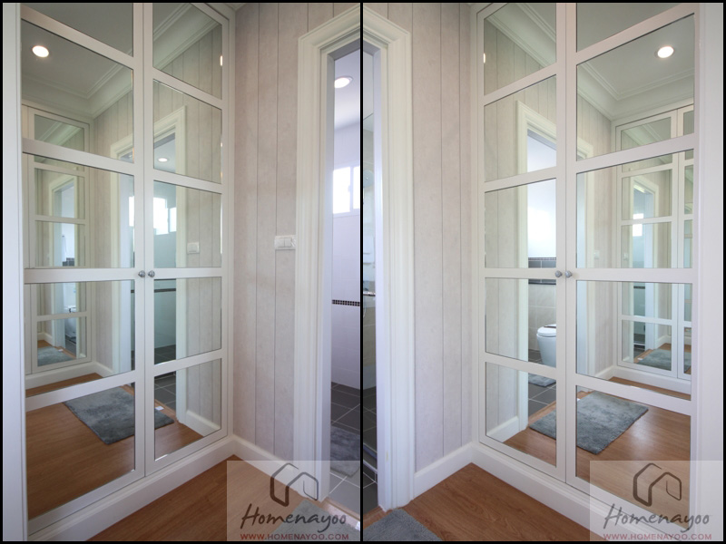 ภายในห้องจะสามารถจัดทำตู้เสื้อผ้าแบบ Built – in วางไว้ฝั่งขวามือได้ ส่วนผนังด้านในจะวางเป็นโต๊ะเครื่องแป้งก็ได้ค่ะ ถ้าอยากได้กระจกบานใหญ่ๆติดผนังก็จะต้องเสียหน้าต่างไป แต่ถ้าใครไม่ซีเรียสจะวางเป็นกระจกแบบตั้งโต๊ะบานใหญ่ๆแบบมี 2 ด้านแล้วใช้แสงธรรมชาติในการแต่งหน้าก็ทำให้เห็นรายละเอียดที่ชัดเจนดี