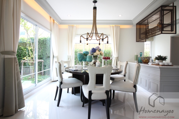 ทางบ้านตัวอย่างได้จัดโต๊ะรับประทานอาหารสำหรับ 6 ที่นั่งแบบโต๊ะกลมเอาไว้ หรือจะเปลี่ยนเป็นแบบโต๊ะสี่เหลี่ยมผืนผ้าเหมือนหลังที่ผ่านมาก็ได้เช่นกัน