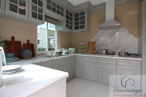 มุมมองเข้าไปภายในห้องครัว ห้องครัวของบ้านนี้มีพื้นที่ที่กว้างขวางมาก สามารถทำเคาน์เตอร์เป็นรูปตัว U แล้วยังเหลือพื้นที่ตรงกลางกว้าง 1.7 เมตร สามารถเข้ามาช่วยกันทำครัวได้ทีละหลายคนเลย