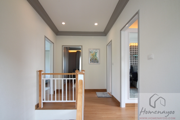 มุมมองจากชานพักบันไดตอนบนขึ้นไปยังโถงบันไดชั้น 2 ฝั่งซ้ายจะเป็นห้องนอน Master bedroom, ตรงกลางเป็นห้องนอน 2 และฝั่งขวาจะเป็นจะเป็นประตูห้องนอน 3 และห้องน้ำ 2 พื้นชั้น 2 ปูด้วยไม้ลามิเนต ผนังเป็นผนังเรียบติดวอลเปเปอร์ให้