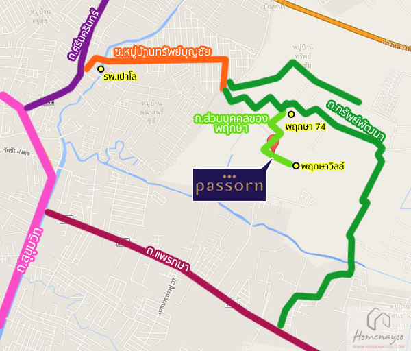 ที่ตั้งโครงการอยู่ในพื้นที่ของพฤกษาซึ่งจะมีหลายโครงการอยู่ในละแวกเดียวกัน ถนนหน้าโครงการจึงเป็นถนนส่วนบุคคลของพฤกษาค่ะ ซึ่งถนนเส้นนี้จะเชื่อมกับซอยหมู่บ้านทรัพย์บุญชัยและถนนทรัพย์พัฒนา โดยปากซอยหมู่บ้านทรัพย์บุญชัยนั้นจะเชื่อมกับถนนศรีนครินทร์และเทพารักษ์ ส่วนถนนทรัพย์พัฒนาจะเชื่อมกับถนนแพรกษา แต่สองเส้นนี้จะคดเคี้ยวค่ะ ดังนั้นถ้ารู้จักเส้นทางดีจะทำให้เดินทางง่ายขึ้น
