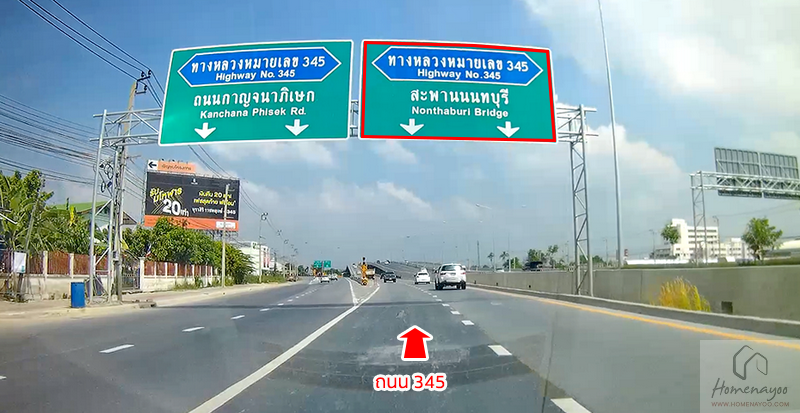 จากไทวัสดุให้เราเตรียมตัวชิดซ้าย เพื่อเบี่ยงออกไปยังถนน 345 โดยฝั่งที่เราจะเดินทางไปคือฝั่งของสะพานนนทบุรี
