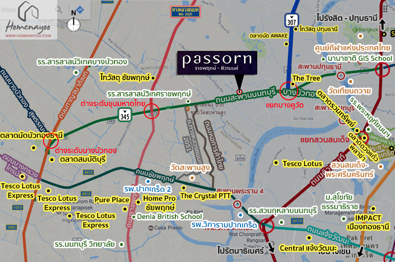 การเดินทางเริ่มจาก แยกต่างระดับบางรักน้อย ⇒ ถนนราชพฤกษ์ ⇒ แยกต่างระดับสาลีโข ⇒ แยกต่างระดับขุนมหาดไทย ⇒ ถนนสะพานนนทบุรี-บางบัวทอง (345) ขับตรงไปประมาณ 3.4 กิโลเมตรถึงโครงการ Passorn ราชพฤกษ์-ติวานนท์ *ใกล้สำนักงานเทศบาลเมืองบางคูวัด