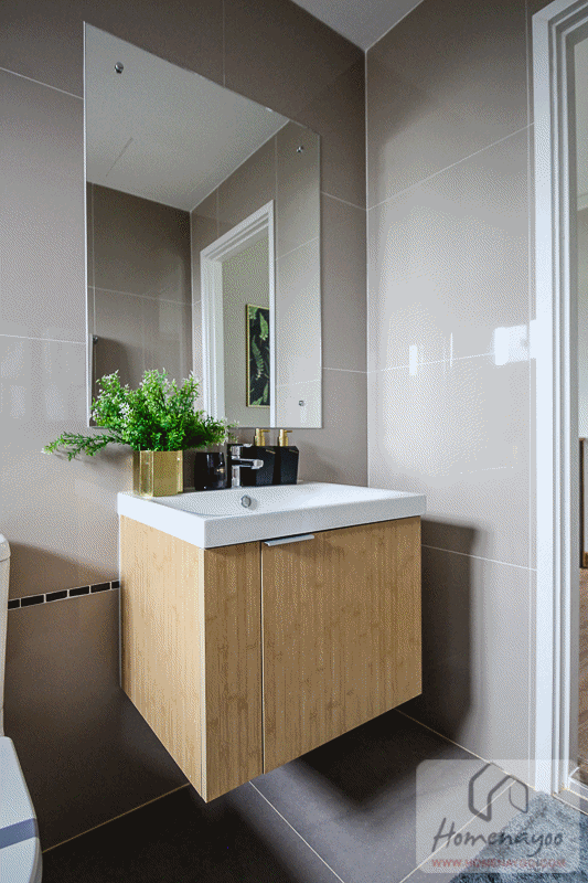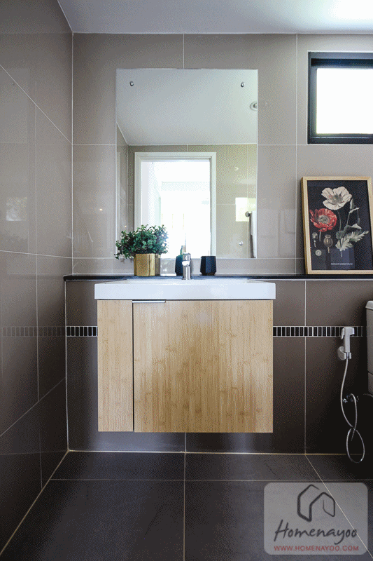 ส่วนอ่างล้างมีมีชั้นวางของใต้อ่างพร้อมหน้าบานปิดผิวลายไม้มาให้พร้อมกระจกเงาของจริงได้ตามนี้