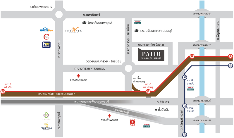ทำเลที่ตั้งโครงการ – ที่ตั้งโครงการ Patio พระราม 5 – สิรินธร อยู่ในซอยบางกรวย-ไทรน้อย 26 หรือซอยวัดโคนอน ปากซอยคือถนนบางกรวย-ไทรน้อย ใกล้ Lotus นครอินทร์สะดวกในการจับจ่ายใช้สอย ไม่ไกลจากสถานที่ราชการ, สถานศึกษาและรถไฟฟ้าสายสีม่วง ใกล้สี่แยกบางสีทองซึ่งเป็นแยกที่เชื่อมกับถนนนครอินทร์จึงเดินทางสะดวกเพราะเชื่อมต่อกับถนนหลายสาย ตรงไปยังถนนราชพฤกษ์, ถนนจรัญสนิทวงศ์, ถนนวงศ์สว่าง, ถนนบรมราชชนนี ไม่ไกลจากจุดขึ้น-ลงทางด่วนทำให้เดินทางเข้า-ออกตัวเมืองกรุงเทพและนนทบุรีได้สะดวก