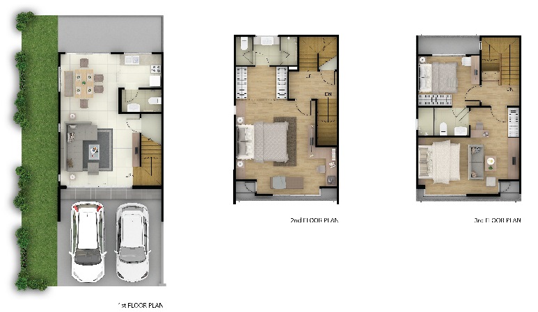 สำหรับตัวบ้านฟังก์ชั่นการใช้งานครบครันและตอบสนองต่อการอยู่อาศัยสำหรับครอบครัวขนาดกลาง พื้นที่ห้องนั่งเล่นกว้างต่อเนื่องไปกับห้องทานอาหาร ห้องครัวเป็นครัวเปิดลักษณะแบบ Pantry ถ้าใครชอบทำอาหารแบบจัดหนักก็ต่อเติมครัวไทยหลังบ้านได้ ชั้นห้องนอนที่ชั้น 2 เป็น Master Bedroom ขนาดใหญ่ที่มีห้องน้ำในตัวและพื้นที่ส่วน Walk in closet สำหรับชั้น 3 มี 2 ห้องนอนและ 1 ห้องน้ำ ขนาดพื้นที่ใช้สอยกว้างขวางแม้ห้องนอนเล็กสุด ห้องนอน 2 มีพื้นที่นั่งเล่นในตัวและดูกว้างขวาง