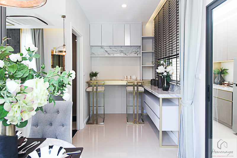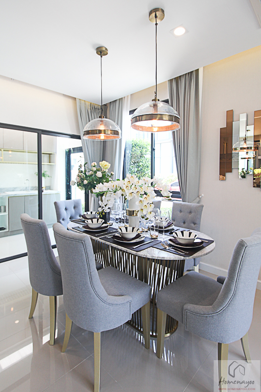 ส่วนถัดไปเป็นมุมทานอาหารและห้องครัว ด้านหลังเป็นส่วนซักล้างโดยมีประตูเป็นประตูกระจกบานเลื่อนบานใหญ่ทำให้มุมนี้ได้แสงธรรมชาติส่องเข้ามา สำหรับบ้านตัวอย่างจะต่อเติมหลังบ้านเป็นครัวค่ะ