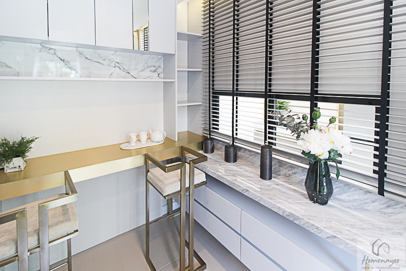 พื้นที่เคาน์เตอร์จะกว้าง ถ้าทำเป็นตัว L แบบนี้เมื่อวางเตาและอ่างล้างจานก็มีพื้นที่เตรียมอาหารอีกเยอะค่ะ หรือจะทำเป็นเคาน์เตอร์เครื่องดื่มแบบบ้านตัวอย่างก็ได้