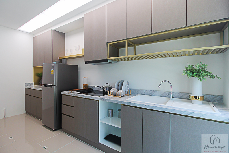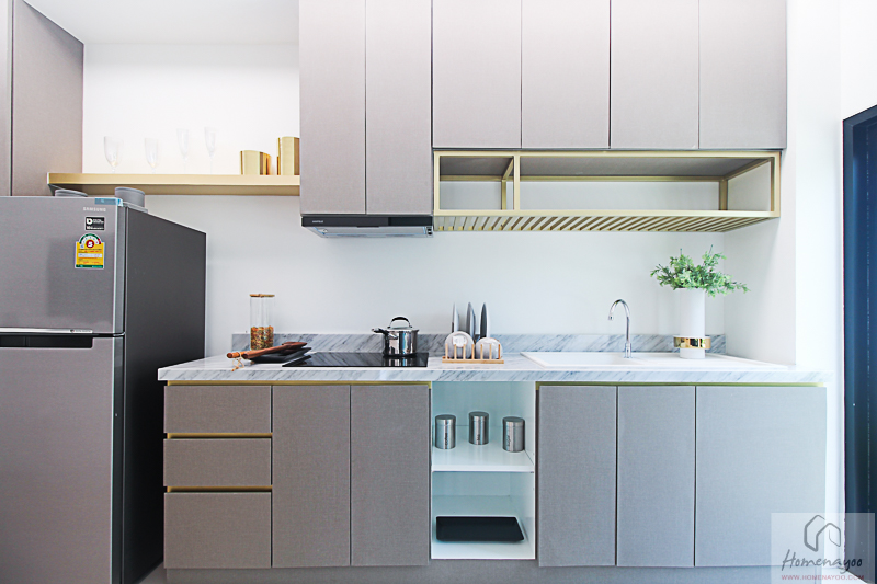 ระยะห่างระหว่างเคาน์เตอร์ครัวกับผนังกว้าง เมื่อมีคนยืนทำอาหารก็ยังมีพื้นที่เหลือที่เดินผ่านใช้งานสะดวก สามารถก้มหยิบของหรือเปิดตู้ก็สะดวก