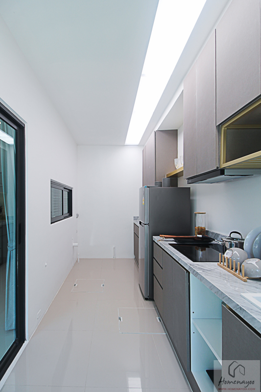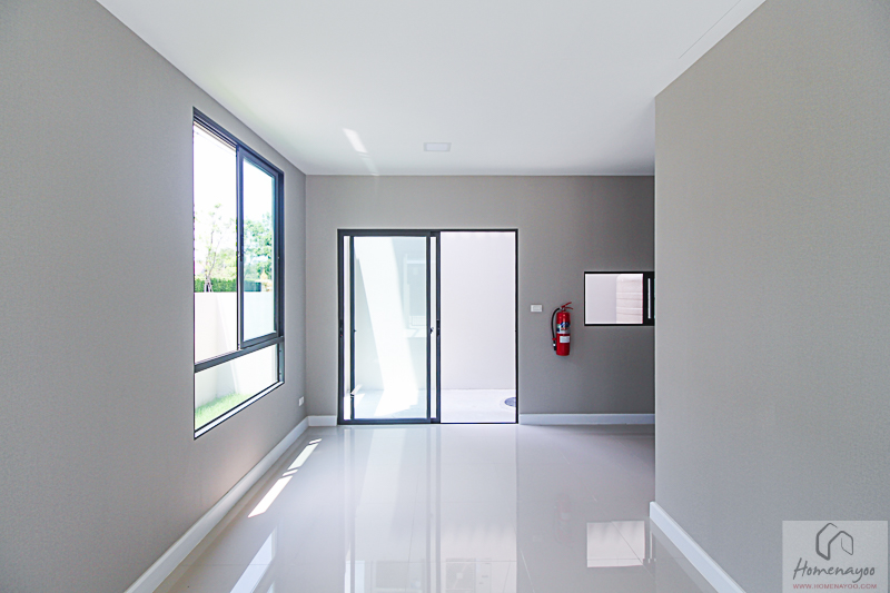 ส่วนหลังบ้านเป็นส่วนซักล้าง ประตูเป็นประตูกระจกบานเลื่อน กรอบอลูมิเนียมสีเทาดำ กระจกเขียวตัดแสง บ้านตัวอย่างตกแต่งให้เป็นครัว
