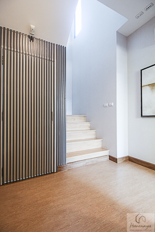 บันไดขึ้นไปยังชั้นบนจะอยู่ติดกับประตูบ้าน พื้นเป็นไม้ยางประสานโทนสีน้ำตาล