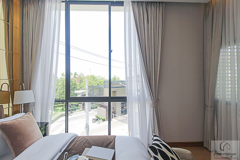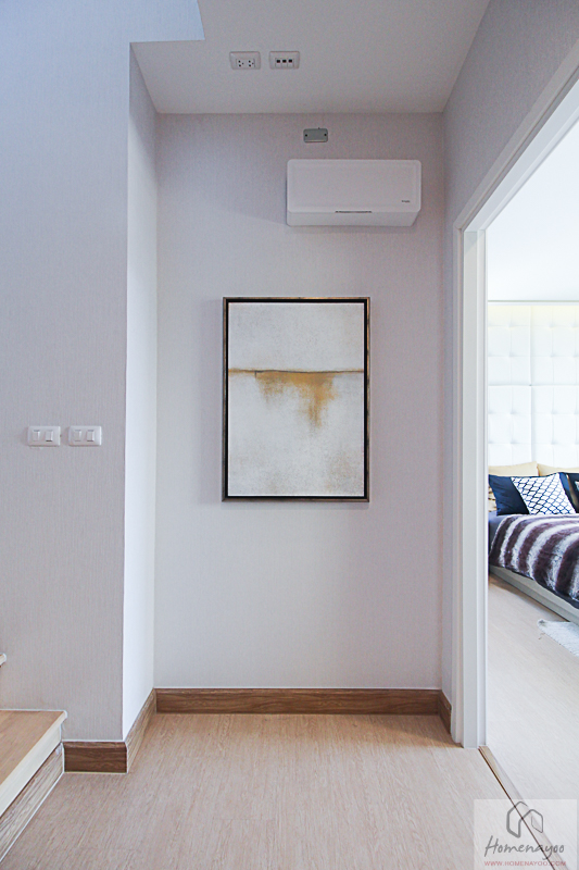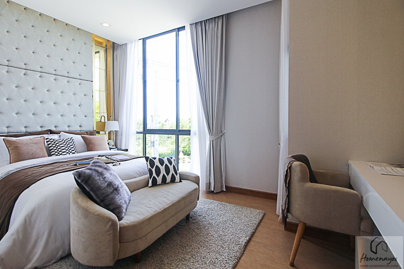 มุมนี้วางเตียงขนาด 5-6 ฟุตได้ บ้านตัวอย่างวางเตียง 5 ฟุต พื้นที่รอบเตียงเหลือให้เดินผ่านใช้งานสะดวก ปลายเตียงสามารถวางโซฟาไว้นั่งเล่นได้