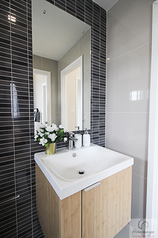ภายในห้องเป็นโทนสีเทา-ขาวทำให้ห้องดูสะอาดและมีสีสันด้วยลายกระเบื้อง ห้องนี้จะไม่มีส่วนอาบน้ำ