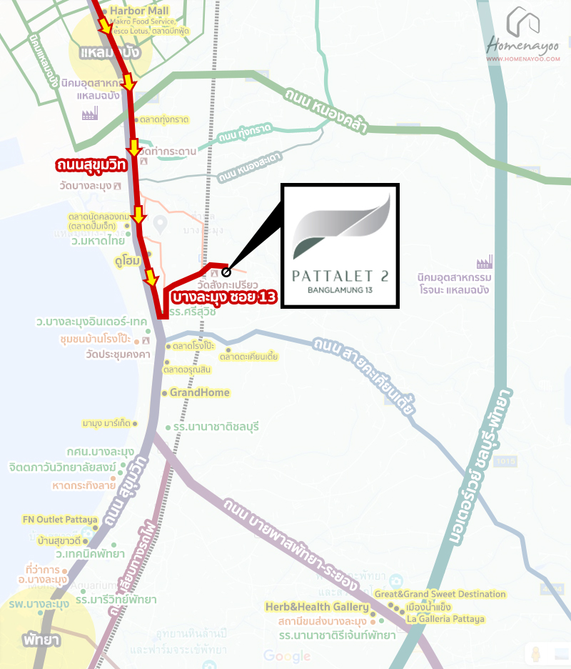 การเดินทางเริ่มจากแยกนิคมฯ แหลมฉบัง  ถ.สุขุมวิท  บางละมุง ซ.13 ขับตรงไปประมาณ 1.8 กม.ถึงโครงการ Pattalet 2 บางละมุง 13 *วัดสังกะเปรียว