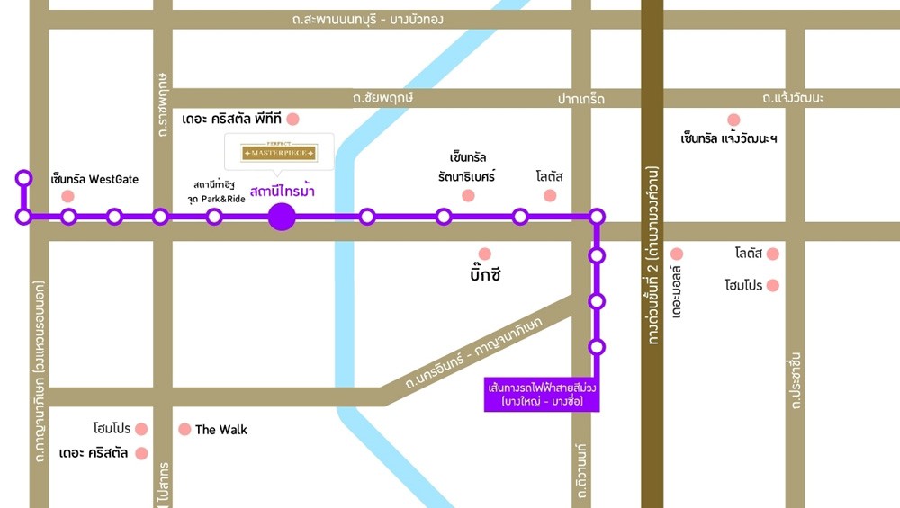 กลับรถก่อนแยกไทรม้า จากนั้นตรงไปประมาณ 350 เมตรถึงโครงการของ พร็อพเพอร์ตี้ เพอร์เฟค