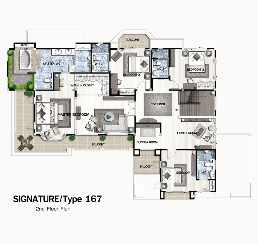 พื้นที่ใช้สอย 553 ตร.ม. 5 ห้องนอน 5 ห้องน้ำ ห้องรับแขก 2 ห้องพักผ่อน ห้องพระ ห้องรับประทานอาหาร มุมกาแฟ ส่วนเตรียมอาหาร ครัวไทย ส่วนซักรีด ห้องแม่บ้านพร้อมห้องน้ำ จอดรถ 4 คัน