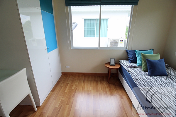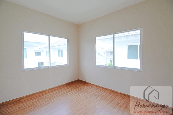 ห้องนอนนี้สามารถวางเตียงคู่ขนาด 5 ฟุตได้นะคะ แต่ห้องตัวอย่างวางเตียงเดี่ยวมาให้ดูเป็นไอเดีย มีหน้าต่างบานเลื่อนคู่มาให้ 2 ฝั่งเช่นกัน