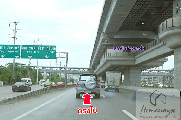 เนื่องจากทางเข้าโครงการ Perfect Park บางบัวทอง นั้นอยู่ฝั่งขาเข้าเมือง มุ่งหน้าไปทางแยกบางใหญ่ เราจึงต้องไปกลับรถใต้สะพานยกระดับก่อนเลี้ยวซ้ายเข้าซุ้มโครงการ