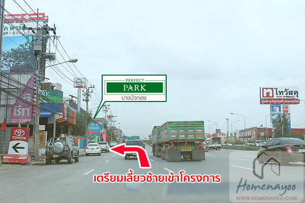 เราจะเห็นป้ายขนาดใหญ่ของโครงการ Perfect Park บางบัวทอง อยู่ทางฝั่งขวามือ ซึ่งอยู่อีกฝั่งทำให้เราต้องวิ่งไปกลับรถก่อนนั่นเอง