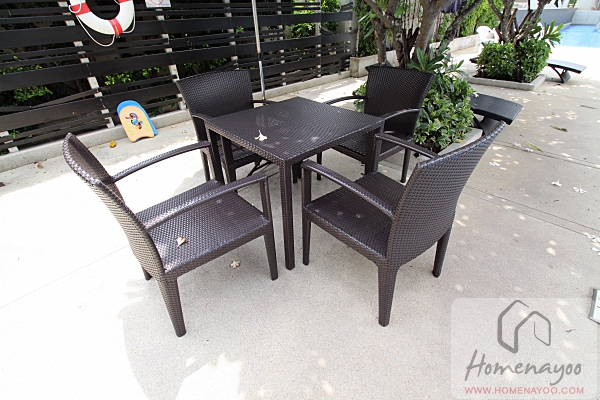 ที่นั่งข้างสระมีทั้งชุดโต๊ะพร้อมเก้าอี้ 4 ตัว