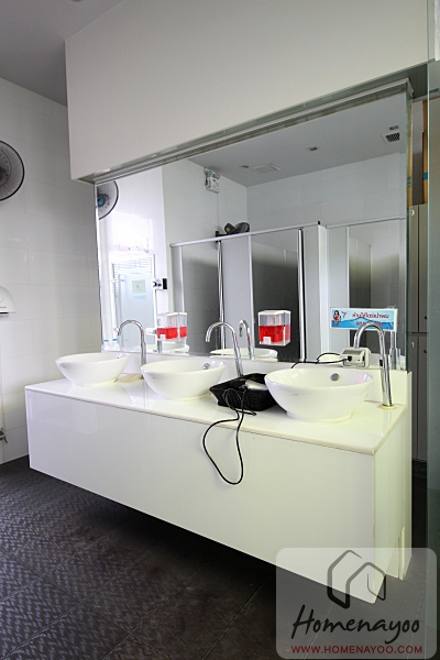 มีเคาน์เตอร์อ่างล้างมือมาให้สามจุดพร้อมกระจกเงาบานใหญ่ และมีไดร์เป่าผมมาให้ด้วย