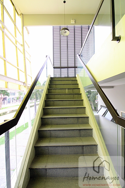ตัวโถงบันไดบ้านตัวอย่างมีเจาะช่องแสงธรรมชาติมาให้ พร้อมโคมห้อยที่เพดานเพิ่มความสว่างให้โถงบันไดตอนกลางคืน แต่ตอนกลางวันไม่มีปัญหาอะไรเพราะช่องแสงเจาะมากว้างอยู่แล้ว พื้นชั้น 2 เป็นไม้ลามิเนตหนา 8 มม. ส่วนราวบันไดจะเป็นเหล็กทาสีขาวท้อปเป็นไม้สีเข้ากันกับพื้นบันไดและพื้น