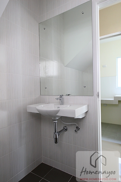 เหนืออ่างล้างมือติดกระจกเงามาให้อย่างที่เห็น ตัวอ่างล้างมือมีราวสแตนเลสมาให้แขวนผ้าเช็ดมือได้ และมี Low Wall หลังอ่างล้างมือและโถสุขภัณฑ์เป็นท้อปหินแกรนิต มาให้วางของเพิ่มได้