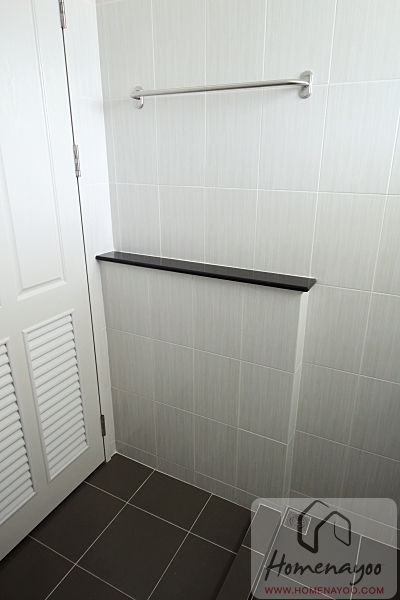 ผนังปูกระเบื้องมาให้จรดเพดาน แต่มีหน้าต่างบานกระทุ้งมาให้ 1 บาน ส่วนอาบน้ำมีฉากกั้นห้องกระจกเทมเปอร์และมีก่อธรณีแยกส่วนเปียกส่วนแห้งมาให้