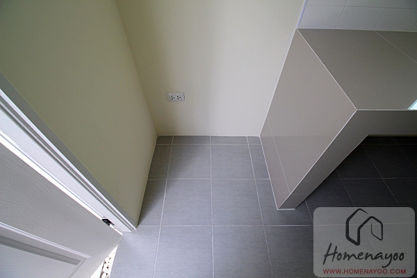 หน้าตาลานซักล้างข้างบ้านติดกับห้องครัวมีขนาดกว้างพอวางเคาน์เตอร์ครัวไว้ผัดทอดปิ้งย่างนอกบ้านได้อีกจุดสบาย และติดไฟผนังเหนือประตูมาให้สำหรับตอนกลางคืน