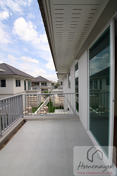 เป็นประตูบานเลื่อนกรอบอลูมิเนียมสีขาว กระจกเขียวตัดแสง มือจับเซาะร่องมาตรฐาน ระเบียงในห้องนอนใหญ่มีขนาดกว้างขวาง สามารถวาง daybed หรือชุดโต๊ะเก้าอี้สำหรับนั่งเล่นรับลมได้สบายๆ