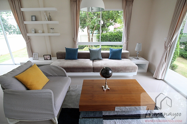 กลับมาที่บ้านตัวอย่างนะคะ ส่วนห้องนั่งเล่นจัดมาเป็นโซฟาแบบ สามที่นั่ง พร้อมวางชั้นวางของยาวด้านข้างและโต๊ะกาแฟพร้อมอาร์มแชร์มาให้ดูระยะใช้งานแบบสบายๆ